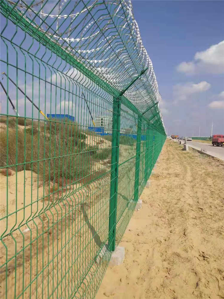 機場護欄網(wǎng)選用優(yōu)質(zhì)低碳鋼絲編制焊接而成,具有美觀、實用、方便運輸和安裝的特點。在機場護欄網(wǎng)的橫向加裝四道折彎加強筋,在整體成本增加不多的同時,使網(wǎng)面強度和美感顯著增加。